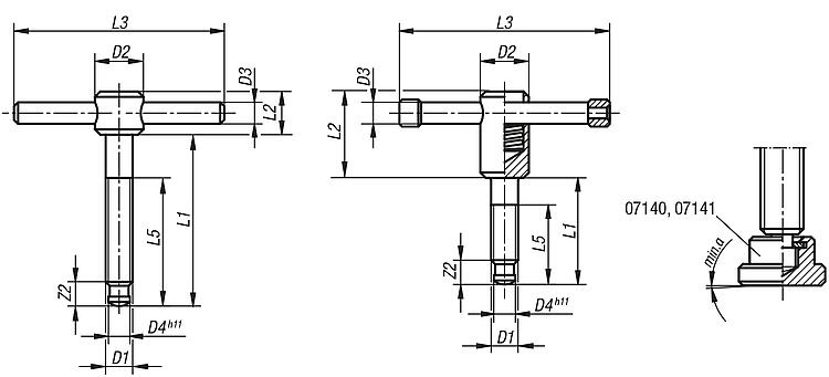 T-thrust screws with fixed or sliding T-bar, DIN 6304 or DIN 6306