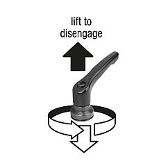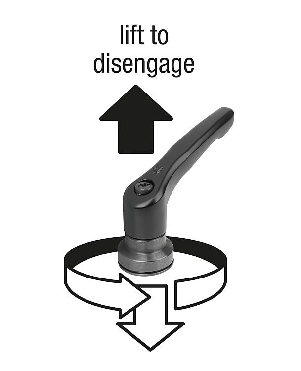 The clamped component is permanently protected by the large, stationary contact surface. A washer is no longer required.Material:Handle die-cast zinc DIN EN 12844. Steel parts grade 5.8.Version:Handle powder-coated. Steel parts black oxidised. Axial needle bearing with hardened and ground thrust washer.Note:Standard colours are: orange RAL 2004, ruby red RAL 3003, silver metallic.Type of operation:In the default position, the handle is engaged with the threaded insert through a toothed ring. By lifting the handle, it can be repositioned and re-engaged in the toothed ring by spring force.Application:Machine, equipment and plant construction, rehabilitation sector.Assembly:The screw-in depth must be at least 2 x the thread diameter and the thread should be lubricated lightly during installation.Advantages:Significant increase of the clamping force with the same tightening torque. High quality axial needle bearing with high load rating and long service life. The component surface is protected by the stationary lower ring.On request:Other colours.Special features: DownloadHere is all the information as a PDF datasheet: