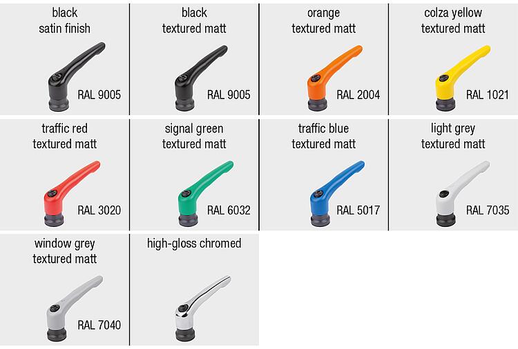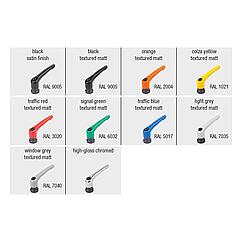 The clamped component is permanently protected by the large, stationary contact surface. A washer is no longer required.Material:Handle die-cast zinc DIN EN 12844. Steel parts grade 5.8.Version:Handle plastic-coated or high-gloss trivalent passivated Steel parts, black oxidised. Axial needle bearing with hardened and ground thrust washer.Type of operation:In the default position, the handle is engaged with the threaded insert through a toothed ring. By lifting the handle, it can be repositioned and re-engaged in the toothed ring by spring force.Application:Machine, equipment and plant construction, rehabilitation sector.Assembly:The screw-in depth must be at least 2 x the thread diameter and the thread should be lubricated lightly during installation.Advantages:Significant increase of the clamping force with the same tightening torque. High quality axial needle bearing with high load rating and long service life. The component surface is protected by the stationary lower ring.On request:Other colours.Special features: DownloadHere is all the information as a PDF datasheet: