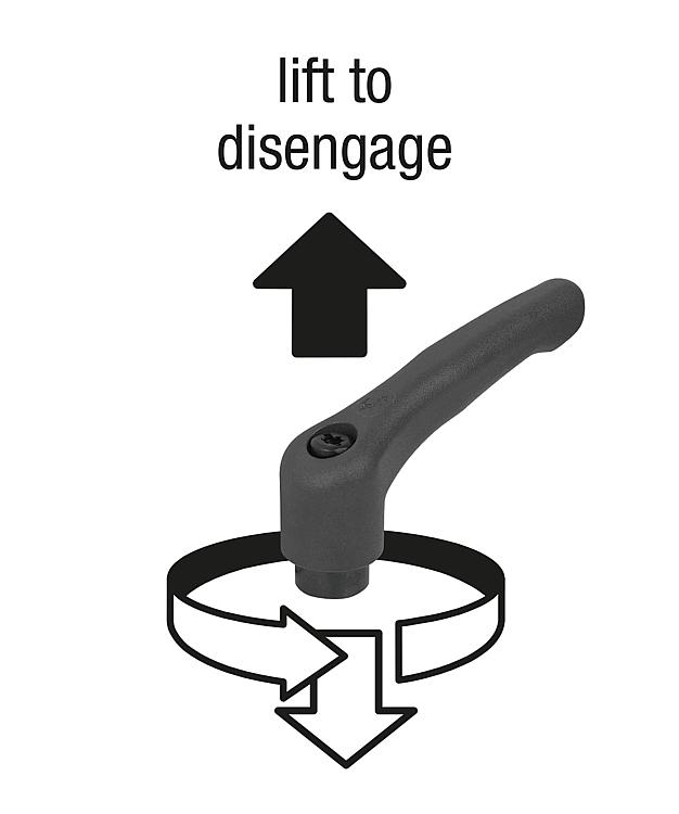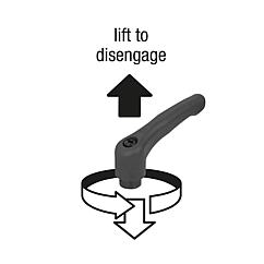 Version:Steel parts bright.Type of operation:When not actuated, the handle is engaged in the tooth insert by a gear ring, thus allowing the thread to be fastened or released. When raised, the handle can be re-positioned and then re-engaged in the gear ring by spring force.Application:Machine, equipment and systems engineering, rehab applications, medical technology, food processing industry.Temperature range:Permanent temperature max. 100 °C.