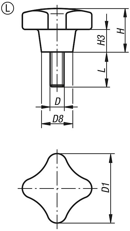 Palm grips, similar to DIN 6335, Form L with external thread