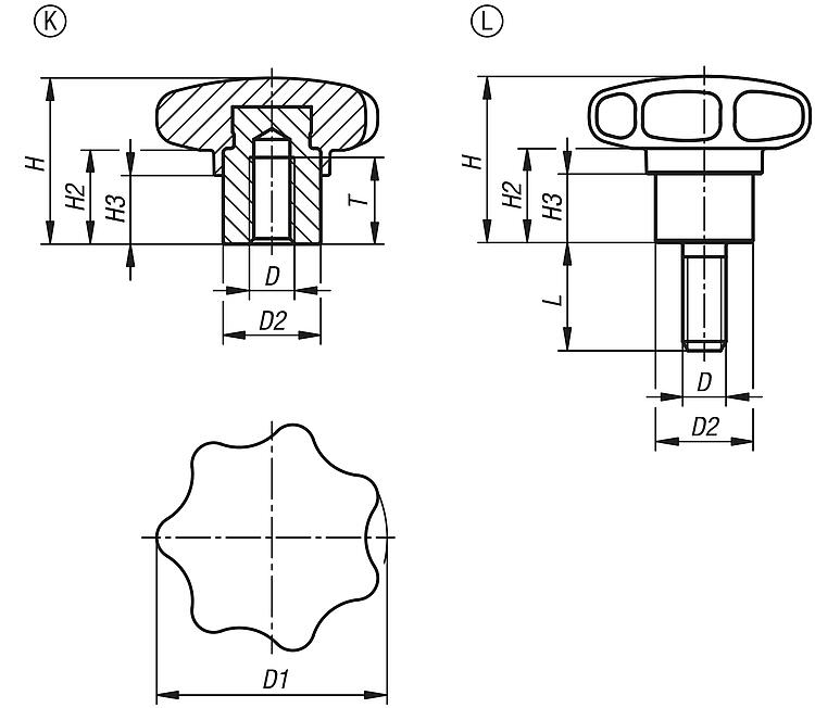 Star grips, plastic with protruding steel bush, Form K, tapped bush