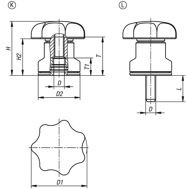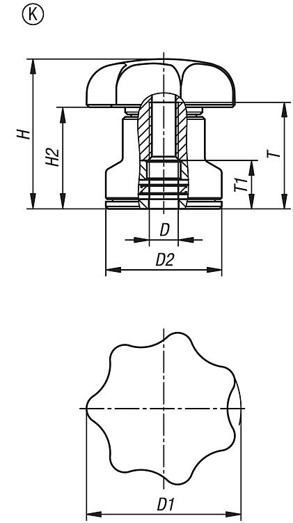 Star grips, plastic, Form K, with clamping force intensifier and tapped bush