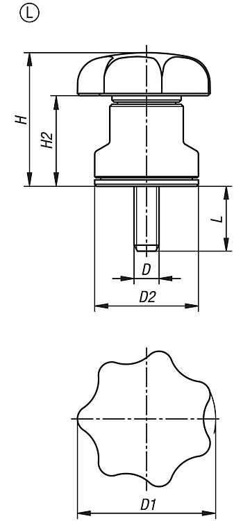 Plastic star grip, Form L, with clamping force intensifier and external thread