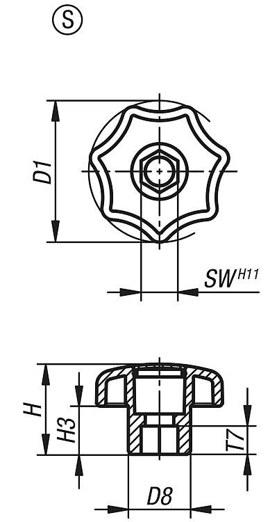 Star grips similar to DIN 6336, internal thread with cap, Form K