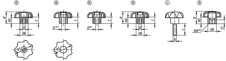 Star grips similar to DIN 6336, internal thread without cap, Form D
