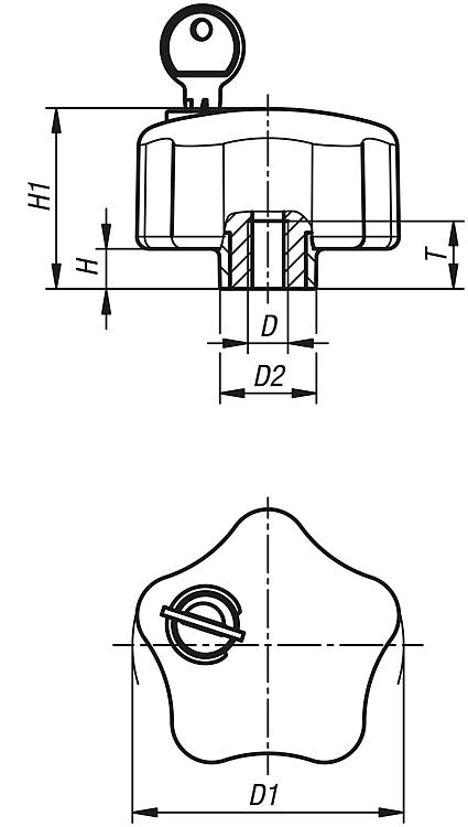 Bush and threaded pin steel grade 5.8 or stainless steel 1.4305. Version:Grip black grey RAL 7021 or red similar to RAL 3020. Steel parts trivalent blue passivated. Stainless steel bright.Note:Lockable five lobe grips prevent unauthorised loosening of the screw connection. The cylinder lock forms a positive lock between grip and screw. When unlocked the grip rotates freely without driving the screw, preventing unauthorised opening of the screw connection.