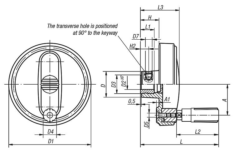 The handwheels can be secured to a shaft using a transverse pin or by parallel key connection together with a DIN 6912 cap screw and a DIN 7349 washer.