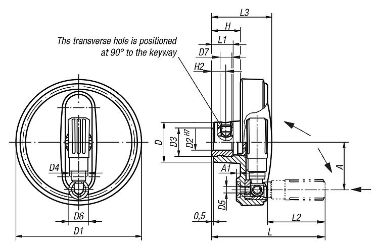 The handwheels can be secured using a transverse pin or by parallel key connection together with a DIN 6912 socket head screw and a DIN 7349 washer.Two actions must be made to bring the cylindrical safety grip into an operating position: