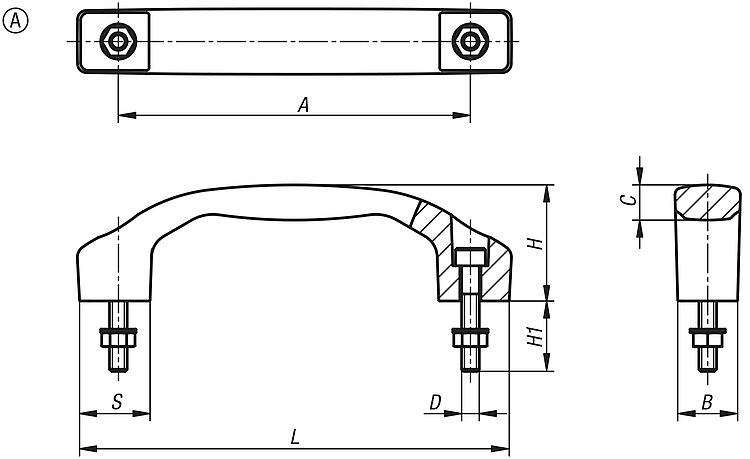 DescriptionMaterial:Thermoplastic PA (polyamide), glass-bead reinforced. Bush, screw, washer and nut steel or stainless steel.Version:Black greyNote:This pull handle is characterised by its large size and pleasant haptics. Form A is supplied with fastening screws, washers and nuts.