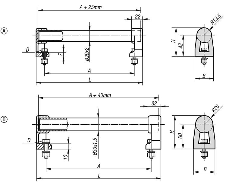 DescriptionMaterial:Grip aluminium EN AW-6060. Legs glass-bead reinforced polyamide.Version:Grip natural colour anodised or with black serrated plastic cover.Note:The legs have 2 or 4 PVC profile pins in the hole for the grip tube. When pushing the tube in these are trimmed off and produce a precise seating. Black electro zinc-plated fastening screws, suitable washers and nuts are supplied.Assembly:From the front.Special features: DownloadHere is all the information as a PDF datasheet: