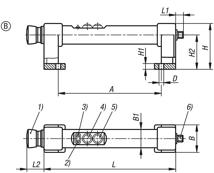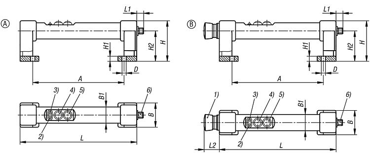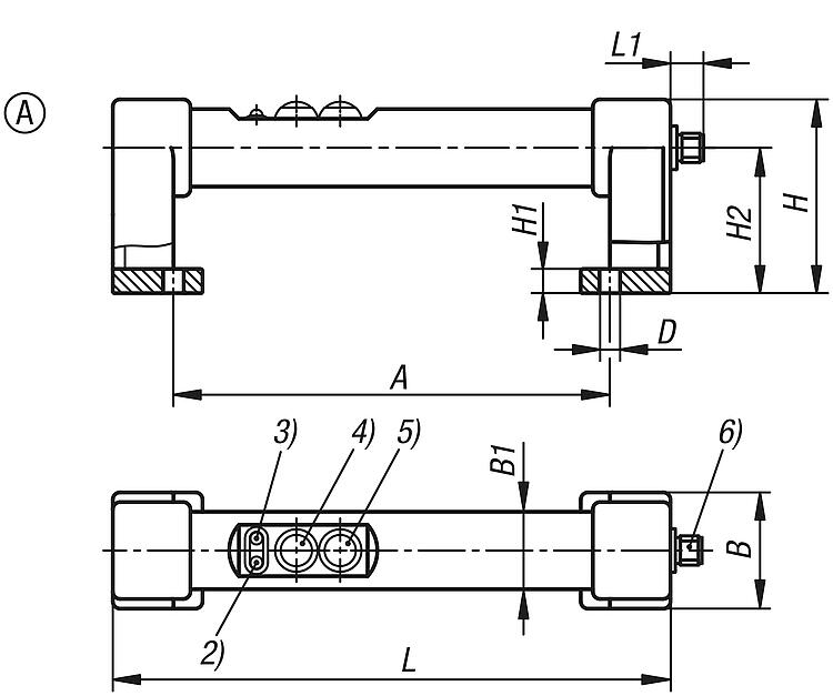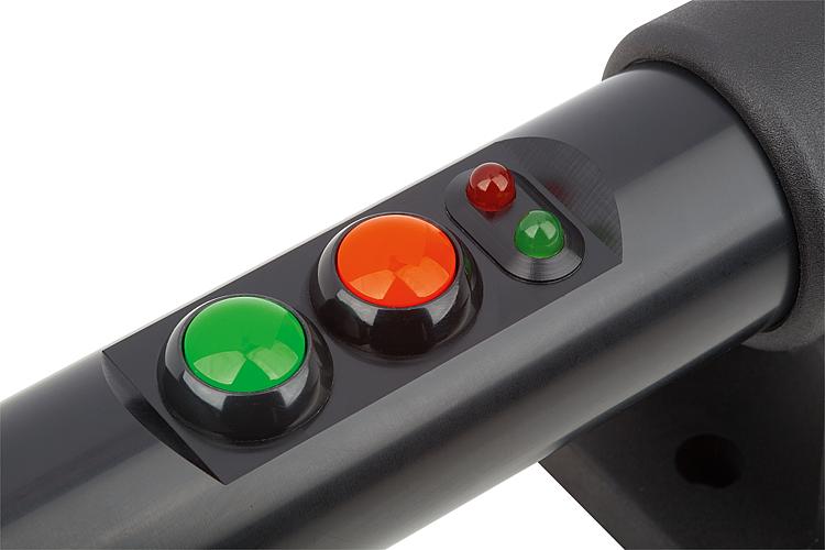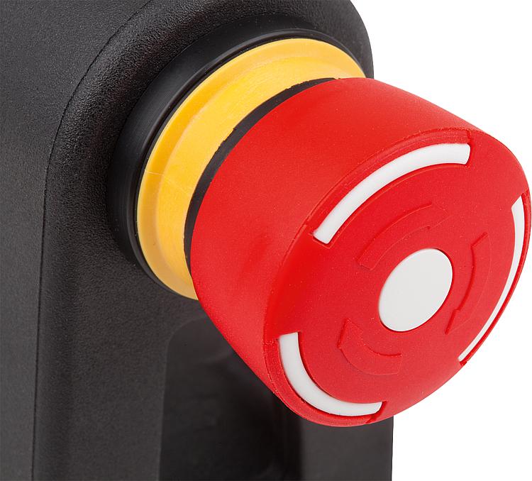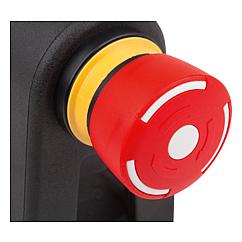 1) Emergency stop 2) Red LED 3) Green LED 4) Push button 1 5) Push button 2 6) Connector, M12x1