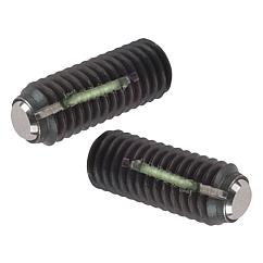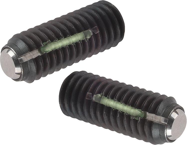 Ball-end thrust screws without head with flattened ball, with thread lock