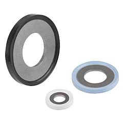 The metallic shim washer with a fixed sealing ring made from 75 EPDM 295 (black) or 70 EPDM 253815 (white) provides a secure, cavity-free seal. The Hygienic USIT® seal and shim washer, made from the fluorinated premium compound Fluoroprene® XP 45, is suitable for applications involving particularly aggressive CIP/SIP cleaning temperatures, high steam sterilisation temperatures and process media containing grease. This material has an even larger operating temperature range and is resistant to polar and non-polar media as well as flavouring substances.