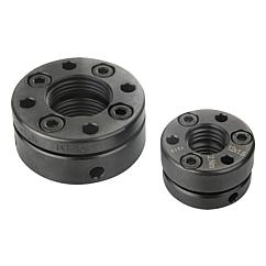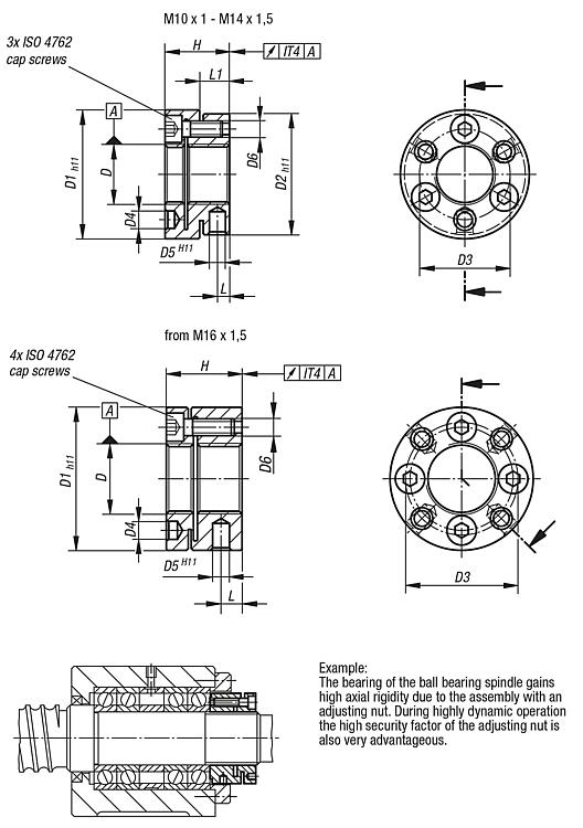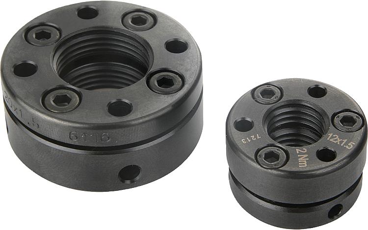 DescriptionMaterial:Steel. Clamping screws carbon steel.Version:Black oxidised. Clamping screws ISO 4762, grade 12.9.Note:Two screw parts that are elastically connected are tightened against each other with screws. The adjustment nut is constructed rotationally symmetric. There are no unbalancing keyways or slots.Note:The adjustment nut can be axially deformed and must be handled with care. The clamping screws may only be tightened when the adjustment nut is completely screwed onto the spindle thread, otherwise the adjustment nut could become defective through unacceptable plastic deformation.Special features: DownloadHere is all the information as a PDF datasheet: