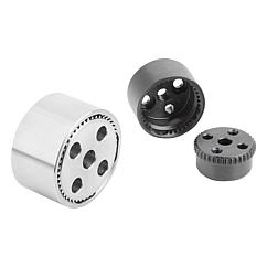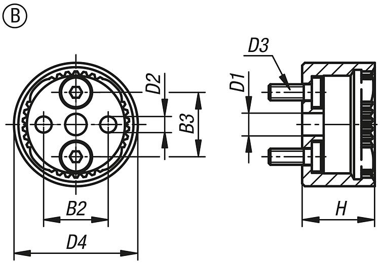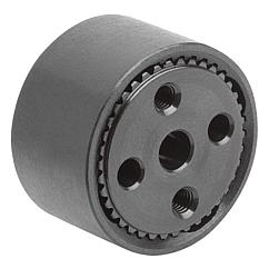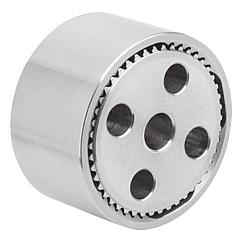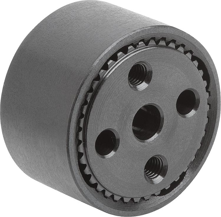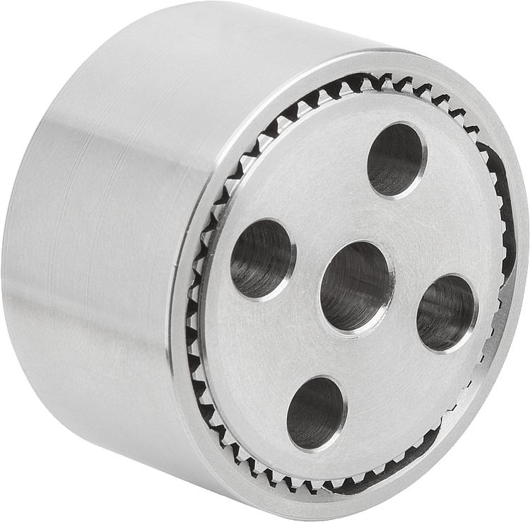 Cap screws steel or stainless steel A 2. Version:Ratchet element black oxidised steel or bright stainless steel. Spring bright. Cap screw blackened steel grade 8.8 or bright A2-70 stainless steel.Note for ordering:2 cap screws M3x8 or M5x10 are supplied with the internal toothed ratchet elements Forms A and B. A stainless steel spring is supplied with the external toothed ratchet elements Forms E to H.Note:Use DIN 7984 low headed cap screws for fastening the Form A and B ratchet elements.Function:The ratchet elements are used for rotary adjustment of components. Fastening options can be arranged according to the application.Accessory:DIN 912/DIN EN ISO 4762 cap screws DIN 6912 cap screwsDrawing reference:Form A: internal toothing, centre tapped hole, 2x counterbores for low headed cap screws, 2x reamed holes Form B: internal toothing, centre through bore, 2x counterbores for low headed cap screws, 2x reamed holes Form C: internal toothing, centre tapped hole, 2x tapped holes for fastening, 2x reamed holes Form D: internal toothing, centre through bore, 2x tapped holes for fastening, 2x reamed holes Form E: external toothing, centre tapped hole, 2x counterbores for cap screws, 2x reamed holes Form F: external toothing, centre through bore, 2x counterbores for cap screws, 2x reamed holes Form G: external toothing, centre tapped hole, 2x tapped holes, 2x reamed holes Form H: external toothing, centre through bore, 2x tapped holes, 2x reamed holes