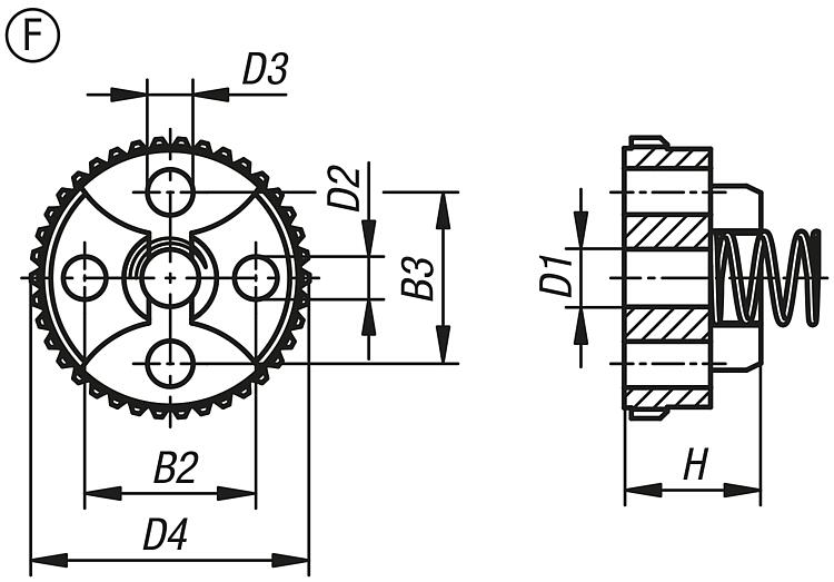 DescriptionProduct description:Ratchet elements are used to connect two components together in any angular position with a positive fit. The ratchet elements with internal toothing (Forms A–D) can be combined with the ratchet elements with external toothing (Forms E–H) in any way depending on the application and installation possibilities. The springs mean that a new angular position can be quickly implemented. Material:Ratchet element steel or stainless steel 1.4305.