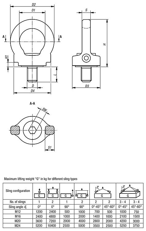 Note:In contrast to DIN 580 ring bolts, the ring is pivot mounted, therefore the direction of force is adjustable and unintended under or over tightening is precluded.