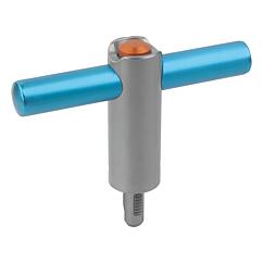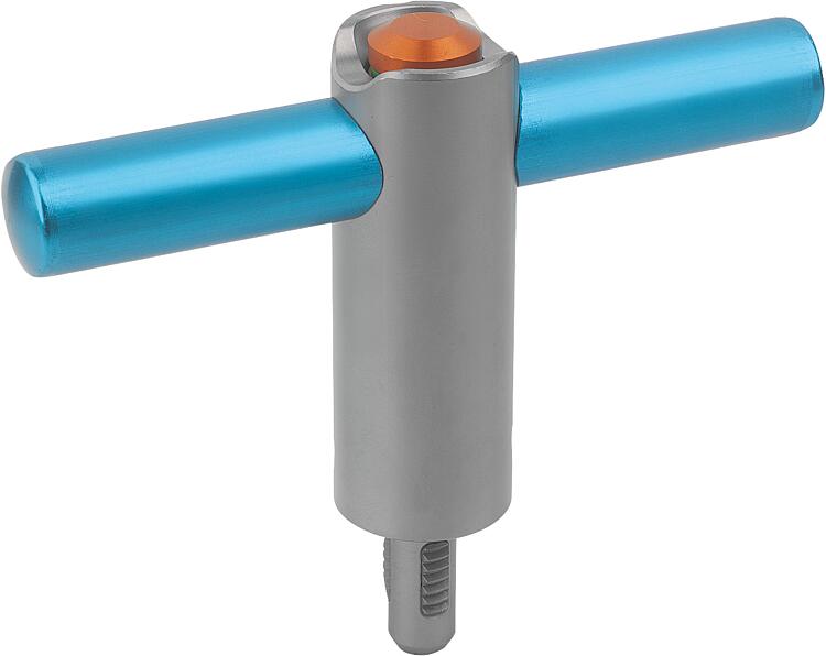 DescriptionMaterial:Version:Pin and threaded element precipitation-hardened. Grip blue anodised. Push button orange anodised.Note:Threaded lifting pins with grip can be used as a quick and easy universal carrying element for moving components, workpieces, equipment etc. by hand. The threaded segments are retracted by pressing the push button and the threaded lifting pin can be inserted into or removed from a tapped hole. When the push button is released, the threaded segment engages securely. This eliminates time-consuming screwing in and unscrewing as by e.g. ring bolts.