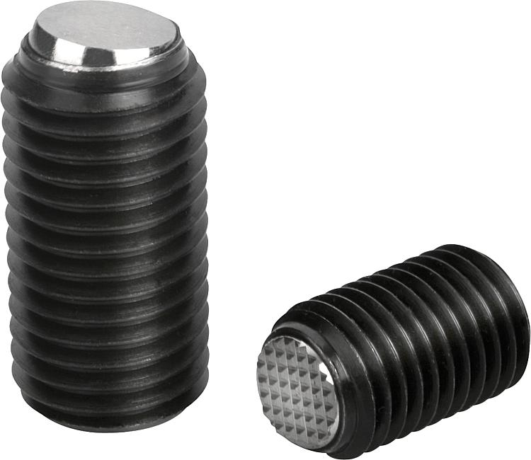 Ball-end thrust screws without head with flattened ball and rotation lock