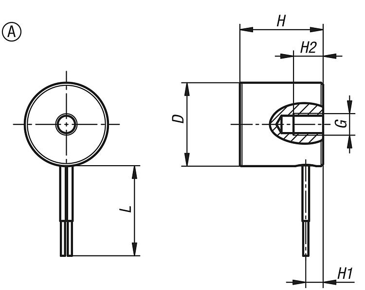 By D = 15, the electromagnet only has a large thread in the centre.Technical data:Voltage: 24V DC. Rating: up to IP 65. Temperature range: up to 155 °C (insulation class F). Duty cycle: 100 %.Application:The electromagnets are used for holding, supporting and fixating ferromagnetic workpieces.On request:Voltage 12V DC.Drawing reference:Form A: Wire from the side Form B: Wire from underneath Special features: DownloadHere is all the information as a PDF datasheet: