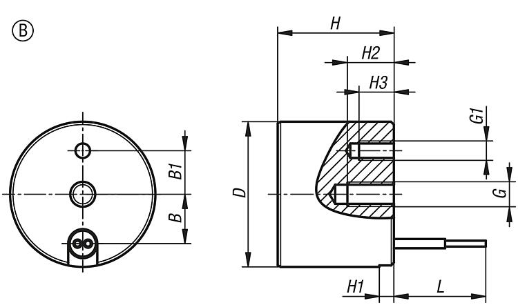 Order No. | Form | B | B1 | D | G | G1 | H | H1 | H2 | H3 | L | Magnetic force N | W | Nom. tension VDC | CAD | Acc. | Price | Order |