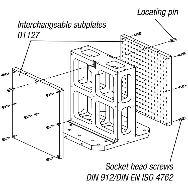 DescriptionMaterial:GJL 300.Version:Support and mounting surfaces precision machinedNote:Interchangeable subplates can be positioned and mounted on both sides of the tombstone. This means that clamping fixtures can be replaced efficiently. The tombstones conform to machine tables for machine tools acc. to DIN 55201 and JIS6337-1980. Please order locating pins for positioning tombstones on machine tables acc. to DIN 55201 separately.