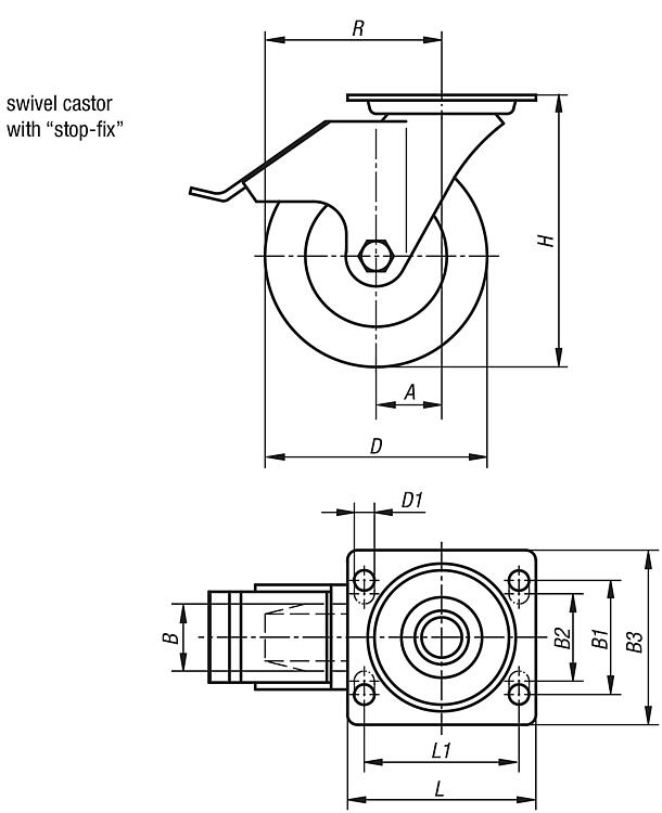 | 95018-125372 | Swivel castor | with stop-fix locking system | roller bearing | 40 | 37 | - | 60 | 85 | 125 | 9 | 150 | 100 | 80 | 102,5 | 200 |  | | on request | |