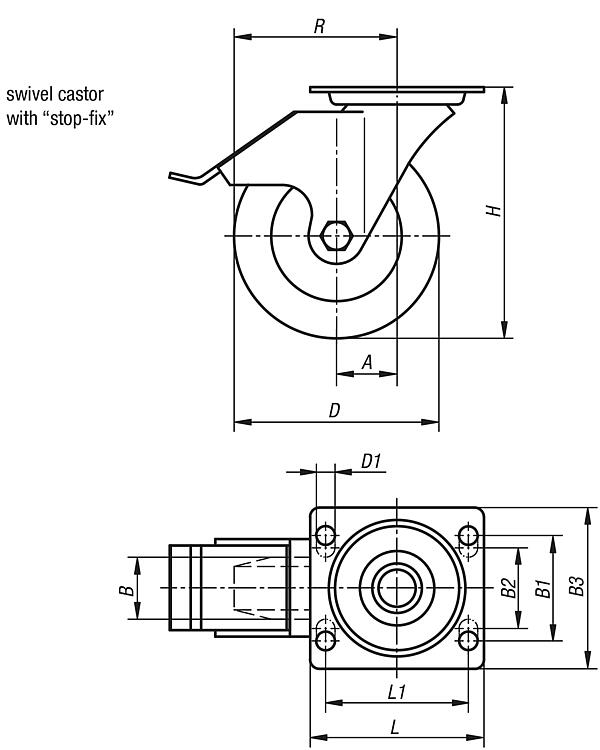 | 95024-125352 | Swivel castor | with stop-fix locking system | Plain bearing | 40 | 40 | 60 | - | 85 | 125 | 9 | 150 | 100 | 80 | 102,5 | 200 |  | | on request | |
