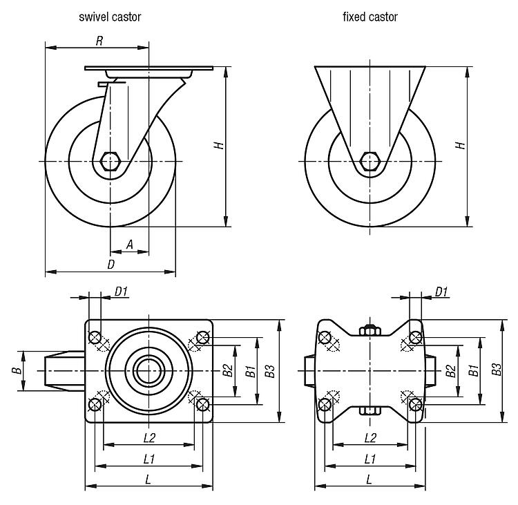 DescriptionMaterial:Housing, steel plate. Wheel tread, high quality polyurethane elastomere. Wheel rims, die-cast aluminium.Version:Housing, press-formed. Swivel housing, double-row ball bearings in a swivel head. Ball bearing wheel axle bearings.Note:Wheel axle bolted. Swivel and fixed castors with mounting plate.Application:Heavy loads can be easily transported using this load handling equipment. The roll and swivel resistance is reduced with this new wheel series designed for intralogistic heavy load applications.Temperature range:-25 °C to +70 °C DownloadHere is all the information as a PDF datasheet: