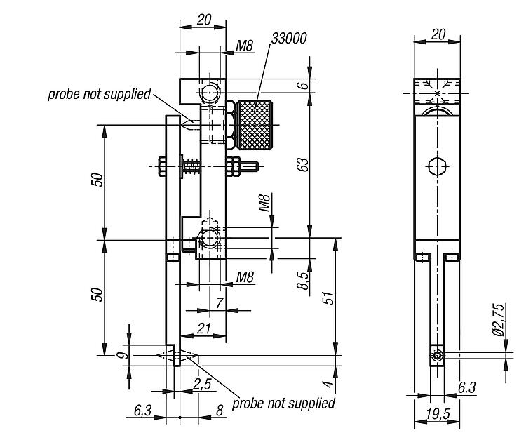 DescriptionMaterial:Body aluminium. Probe lever investment cast steel.Version:Body black anodised. Probe lever black oxidised.Note:To alter the probe direction and mounting of the deflection dial gauge holder with the fastening adaptors (supplied) see technical information.Accessory:Dial gauges see 32540 and 32542. Probe inserts see 33040 to 33052.Special features: DownloadHere is all the information as a PDF datasheet: