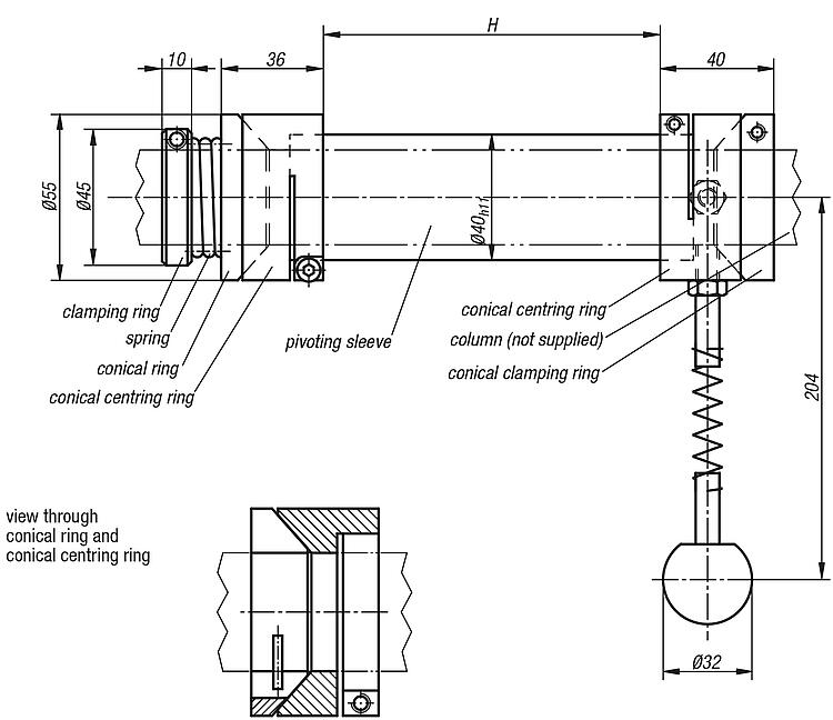 DescriptionMaterial:Steel.Version:Black oxidised.Note:The pivoting systems are adapted to measuring fixtures 33140. Measuring arms see 33150.Assembly:- Place the conical clamping ring on the guide column and clamp in the desired position. - Fix the conical centring ring to the pivoting sleeve and insert it such that the conical centring ring lies on top of the conical clamping ring. - Fix the measuring arm onto the pivoting sleeve. - Fix the second conical centring ring onto the pivoting sleeve. - Insert the conical ring and pressure spring. - Mount the pressure spring on the block with the clamping ring to prevent axial play. - Lubricate all moving parts.Special features: DownloadHere is all the information as a PDF datasheet:
