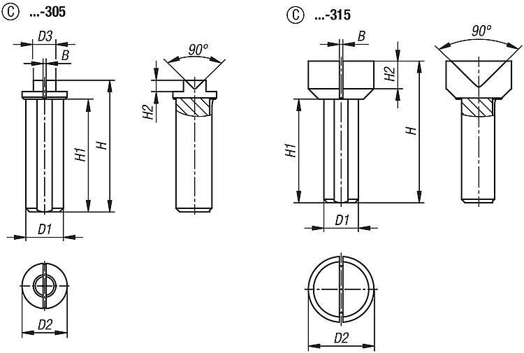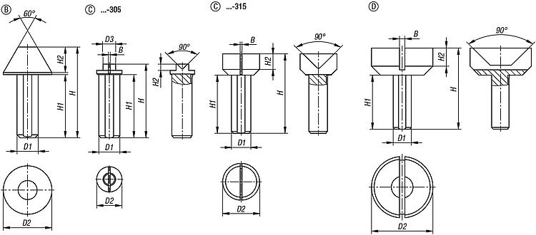 | Order No. | Form | Form definition | B | D min. | D max. | D1 | D2 | H | H1 | H2 | CAD | Acc. | Price | Order |