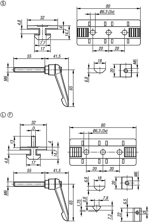 1x M6x55 clamping lever with DIN 9021 6.4 mm washer and special M6 slot key for 8 mm slots.