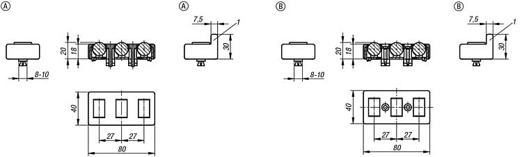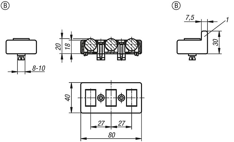 Mounting Form B Insert the lower housing part with rollers into the aluminium profile slot. Set the upper housing part on top and press down. Knocking or screwing the screws in locks and clamps the roller element in the slot. Alternatively, the clamps under the lower housing part can be broken off and the roller element can be securely screwed to the aluminium profile using screws and slot keys.Drawing reference:Special features: DownloadHere is all the information as a PDF datasheet: