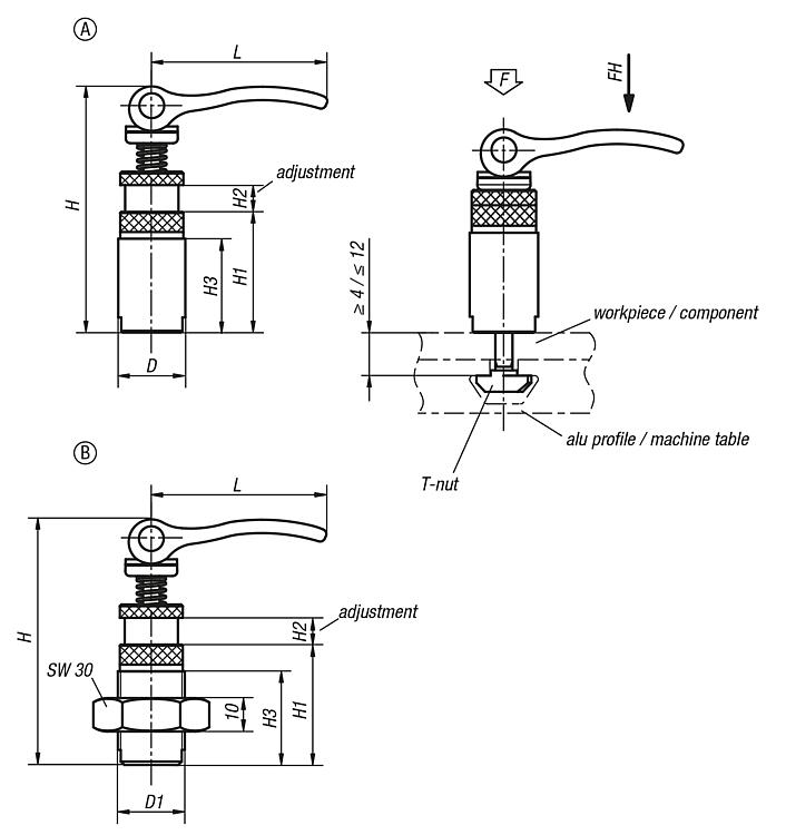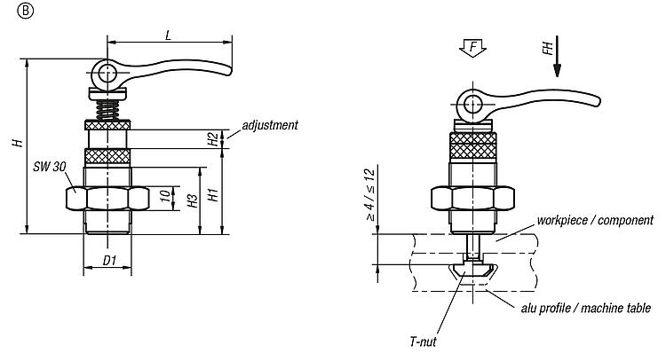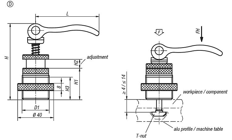 | Order No. | Form | D | H | H1 | H2 | H3 | L | suitable for slot width | Clamping force F (kN) | Hand force FH N | CAD | Acc. | Price | Order |