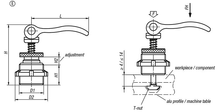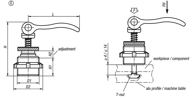 | Order No. | Form | D1 | D2 | H | H1 | H2 | L | suitable for slot width | Clamping force F (kN) | Hand force FH N | CAD | Acc. | Price | Order |