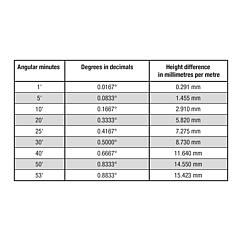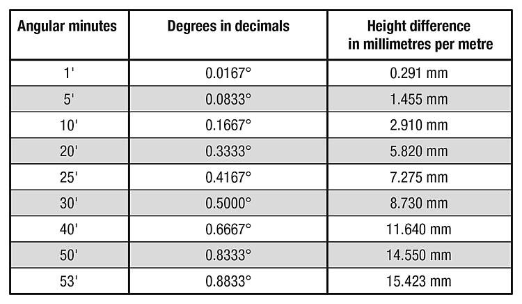 - Sensitivity in angular minutes for 2 mm bubble travel