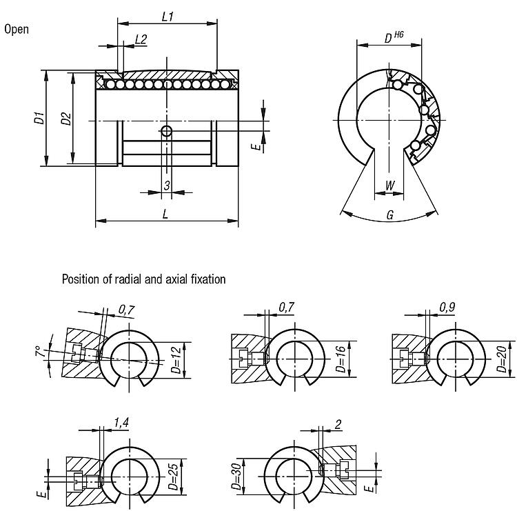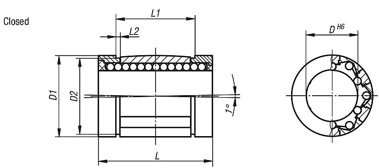 Note:The linear ball bearings correspond to the self-aligning series 3 of ISO 10285. With double-sided seal. These bearings consist of high precision injection moulded plastic housings in which ball bearing steel raceway segments are clipped in. The plastic housing serves simultaneously for recycling and as seal retainer. The seal consists of a special polyamide material with a low coefficient of friction. The bearing is secured with DIN 471/472 circlips.