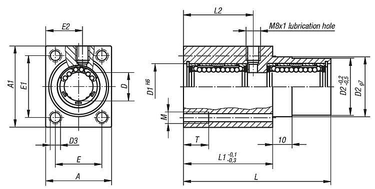 DescriptionMaterial:Housing aluminiumVersion:Housing bright.Note:Ready to install linear housing units consisting of an extruded aluminium housing with two self-aligning linear ball bearings 21510 and seals both sides. The bearings are secured in the housing with DIN 472 circlips.