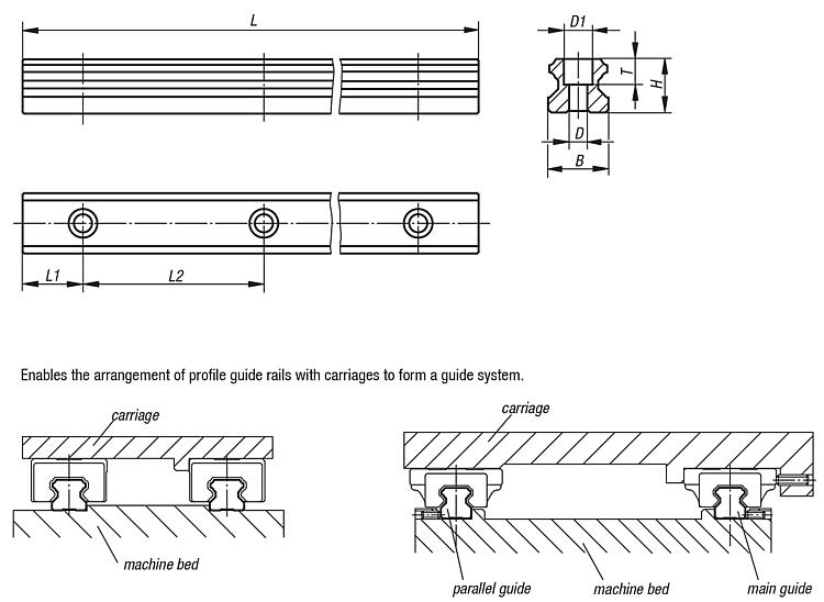 DescriptionMaterial:Steel.Version:Tracks inductively hardened and ground.Note:Profile guide rails can be screwed on from above. The profile guide rails are available in four sizes and one or more carriages can be assembled on them. 4-row versions with round arch profile. The tracks of the profile guide rails are set below an angle of 45° and thus can carry loads from all directions. On request:Lengths up to a max. 3960 mm. DownloadHere is all the information as a PDF datasheet: