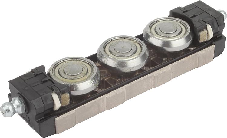 DescriptionMaterial:Race body die-cast aluminium. End pieces polyester. Wipers modified polyamide. longitudinal seals rubber. Rollers steel 1.3505.Version:Runner body nickel-plated.Note:Roller carriage with lifetime lubricated ball bearings and patented wiper technology which lubricates the system while in motion. A simple adjustment of the middle roller makes the roller carriage play-free or sets the desired preload in the rail. High traverse speeds of up to 7 m/s and extremely quiet (faster and quieter than systems with recycling ball bearings).
