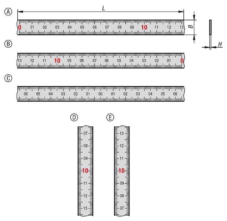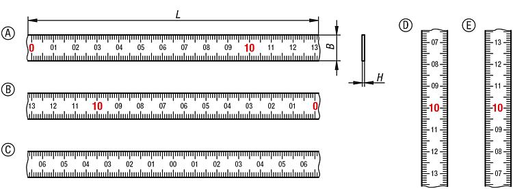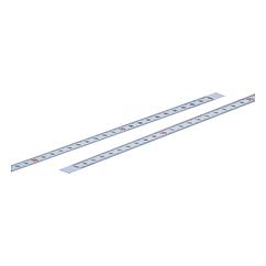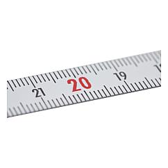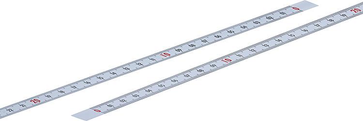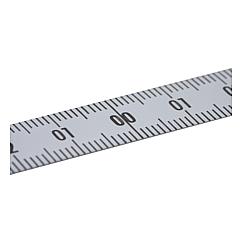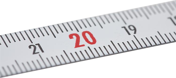 DescriptionMaterial:Steel.Version:Painted white.Note:Scale tapes with mm graduations on top and bottom edge in black and consecutive centimetre numbering. Decimal numbers in red (under 1 m lengths and with centre zero black only).