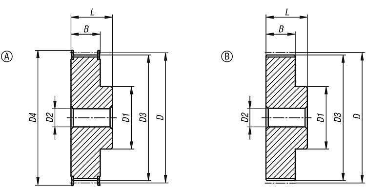 Note:Standard AT-profile with metric pitch (trapezoidal toothing). At least one toothed belt pulley must have a rim flange. The toothed belt pulleys have a centre bore or are pre-drilled (this can vary due to production methods). For this reason, the dimension D2 max. given in the table is the maximum diameter of the bore that the toothed belt pulleys are supplied with. This pilot hole/centre bore can be customised with a reamed hole, reamed hole with keyway or a tapped hole by the customer. Alternatively, bushes can be fitted by the customer to reduce the diameter.
