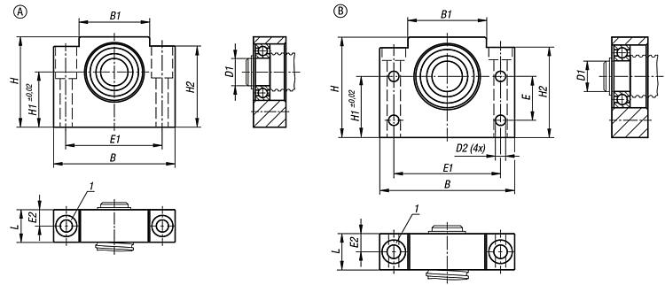 DescriptionMaterial:Housing steel.Version:Housing black oxidised.Note:The axis height of the spindle bearings is matched with the fixed bearing unit 24076. The floating bearing units consist of a housing with deep grooved ball bearing which adapts axially to the linear expansion of the spindle.Drawing reference: