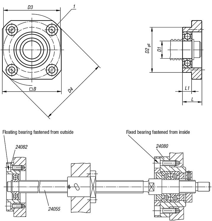 DescriptionMaterial:Housing steel.Version:Housing black oxidised.Note:The floating bearing unit is matched with the fixed bearing unit 24080. The floating bearing units consist of a housing with deep groove ball bearing which adapts axially to the linear expansion of the spindle.Drawing reference: