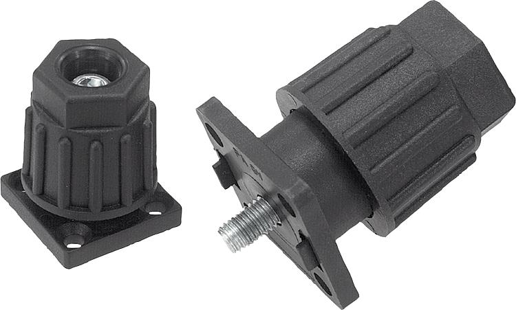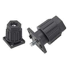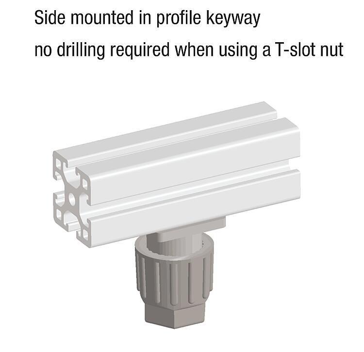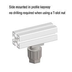 Note:These levelling feet are suitable for tables and lighter installations. The foot height is adjusted by turning the base nut by hand or spanner. The pins on the top flange centre the foot and prevent it turning. These levelling feet can be attached to aluminium profiles using T-slot nuts, no need for drilling.Drawing reference: