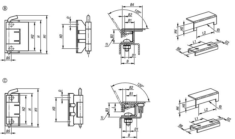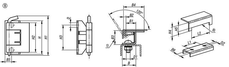 | Order No. | Form | Door part fastening | Pin version | Pin material | Main material | B | B1 | CAD | Acc. | Price | Order |