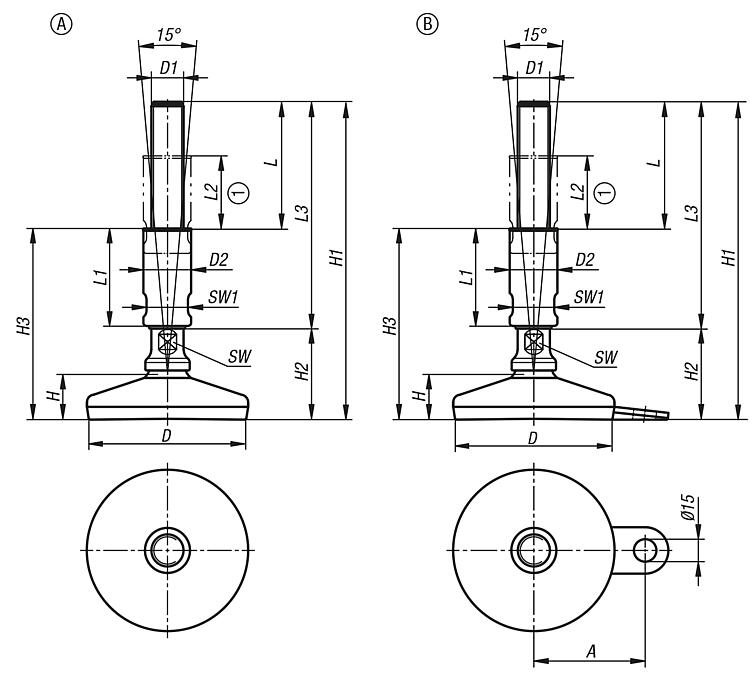 Application:The machine foot is particularly suitable for machines, plants and appliances in the foodstuff industry, breweries, dairies, beverage and pharmaceutical industries.Accessory:Thread cover 27791-10.Drawing reference:
