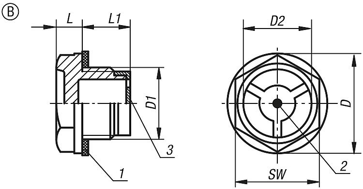 Order No. | Form | D | D1 | D2 | L | L1 | SW | Tightening torque max. Nm | CAD | Acc. | Price | Order |